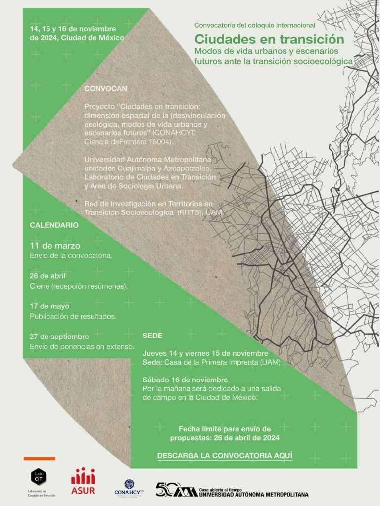 Ciudades en transición Modos de vida urbanos y escenarios futuros ante la transición socioecológica Fecha: 14-16 de noviembre 2024 Sede: Casa de la Primera Imprenta (UAM) CONVOCAN Proyecto “Ciudades en transición: dimensión espacial de la (des)vinculación ecológica, modos de vida urbanos y escenarios futuros” (CONAHCYT: Ciencia de Frontera 15004). Universidad Autónoma Metropolitana unidades Cuajimalpa y […]
